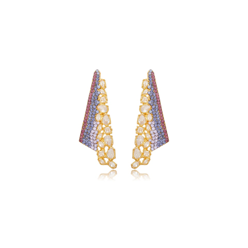 Brinco banho de ouro com aplicações de cristais nas cores branco (cristal), roxo e lilás.