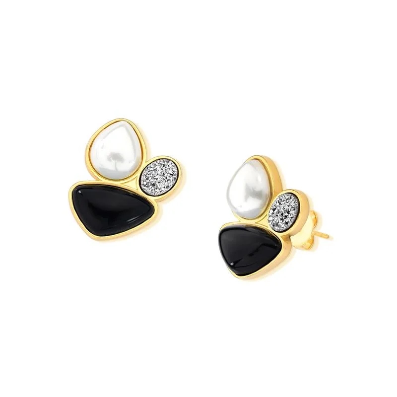 Brinco banho de ouro com pedras naturais ágata preta, titânio e pérola shell.