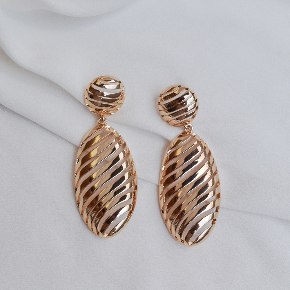 Brinco banhado a ouro com base redonda e penduricalho em gota no metal liso vazado.