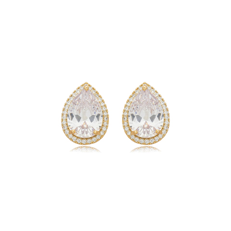Brinco banho de ouro com cravação de micro zircônias e zircônia em gota na cor branco (cristal).