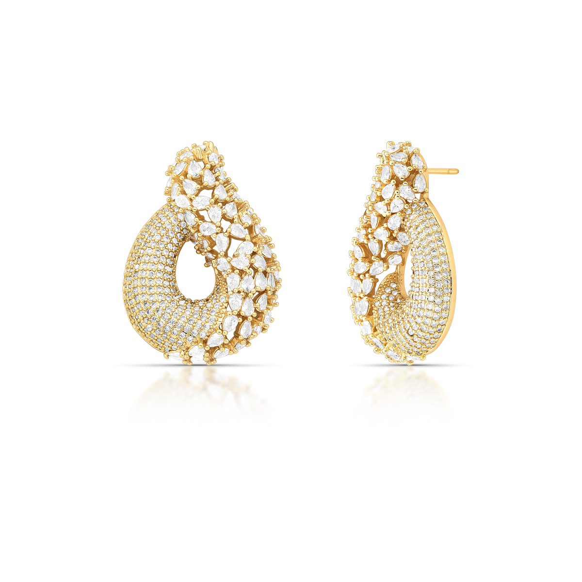 Brinco banho de ouro com design de gota vazada com cravação de micro zircônias na cor branco (cristal).