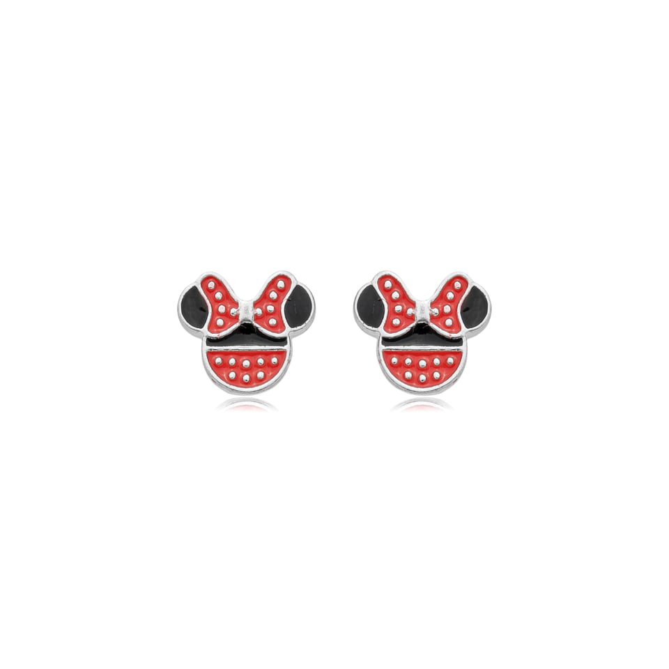 Brinco prata 925 com formato da minie com detalhes no metal esmaltado nas cores preto e vermelho.