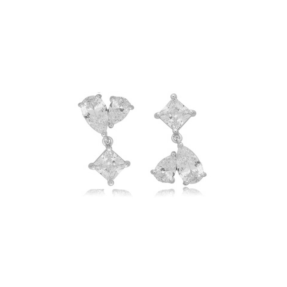 Brinco banho de ródio com zircônias em gota e quadrada cravejadas.