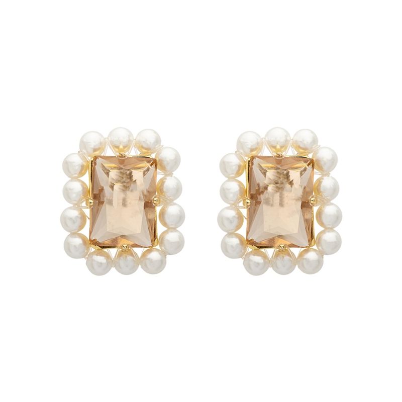 Brinco Lita Raies com pérolas e cristais na delicada tonalidade Light Peach, uma semijoia que combina elegância e suavidade em um design sofisticado. Produzido com banho de ouro, possui acabamento refinado e excelente durabilidade.