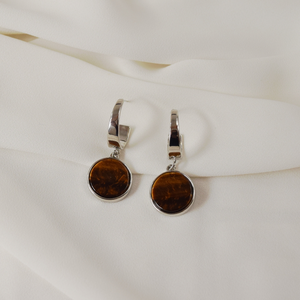 O destaque fica por conta do penduricalho redondo de Olho de Tigre, uma pedra natural conhecida por seus tons quentes e reflexos marcantes que criam um efeito único de profundidade e luminosidade.