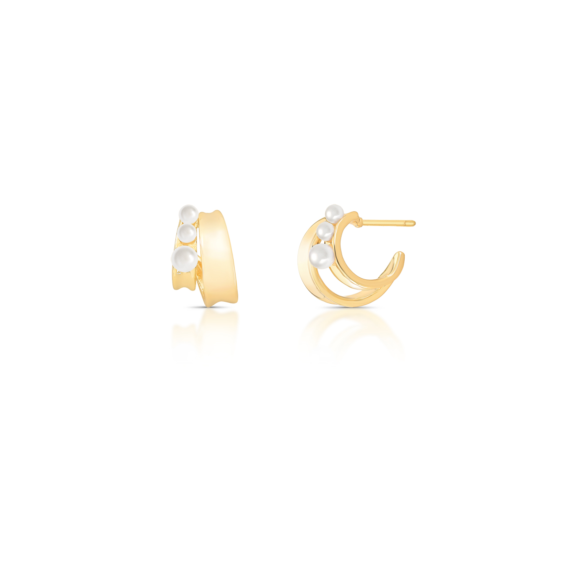 Brinco meia argolinha banhada a ouro com detalhes em pérolas e design vazado curvo, oferecendo delicadeza e charme para complementar qualquer visual com elegância.