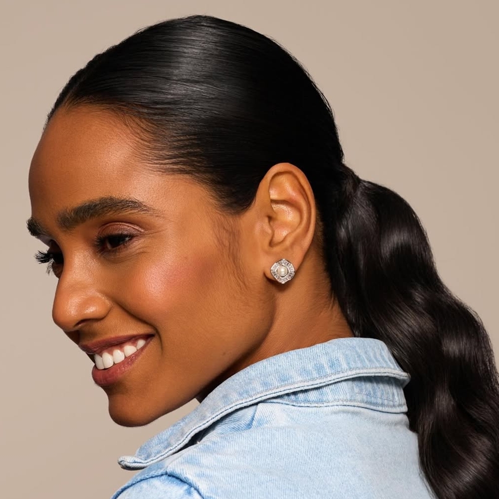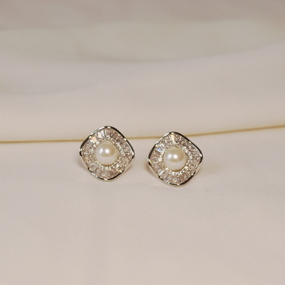 Brinco Ondulado Pérola Shell Zircônia em semijoia com banho de ródio, composto por zircônias baguetes na cor branca que formam uma moldura luminosa ao redor da pérola shell central. Uma peça de design elegante e impecável, que combina brilho sofisticado com a delicadeza da pérola, ideal para valorizar produções clássicas ou contemporâneas.