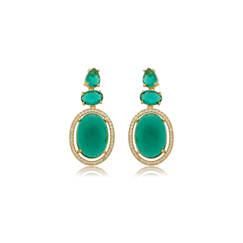 Brinco banho de ouro com micro zircônias cravejadas na cor branco (cristal) e cristais na cor verde.