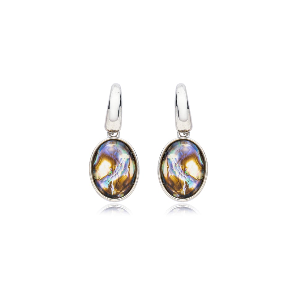 Brinco banho de ródio pedra natural abalone com cristal óptico.
