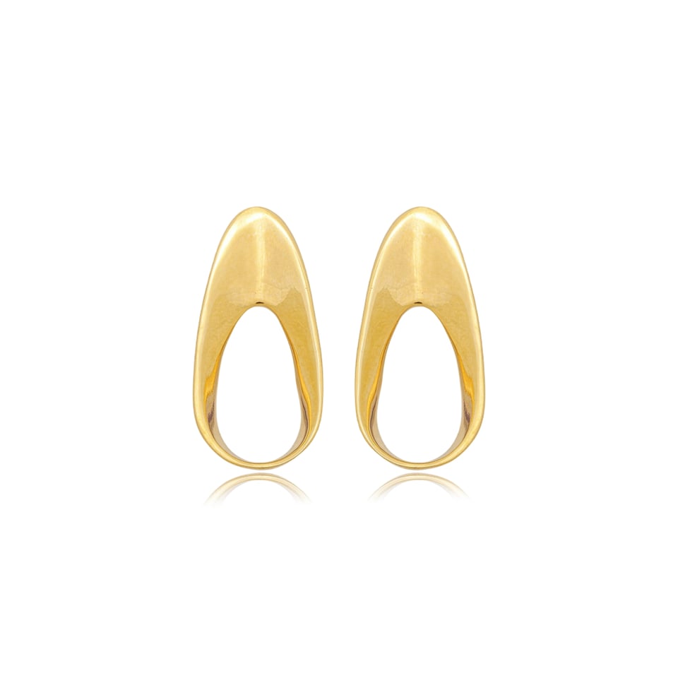Brinco banho de ouro com design oval no metal vazado.