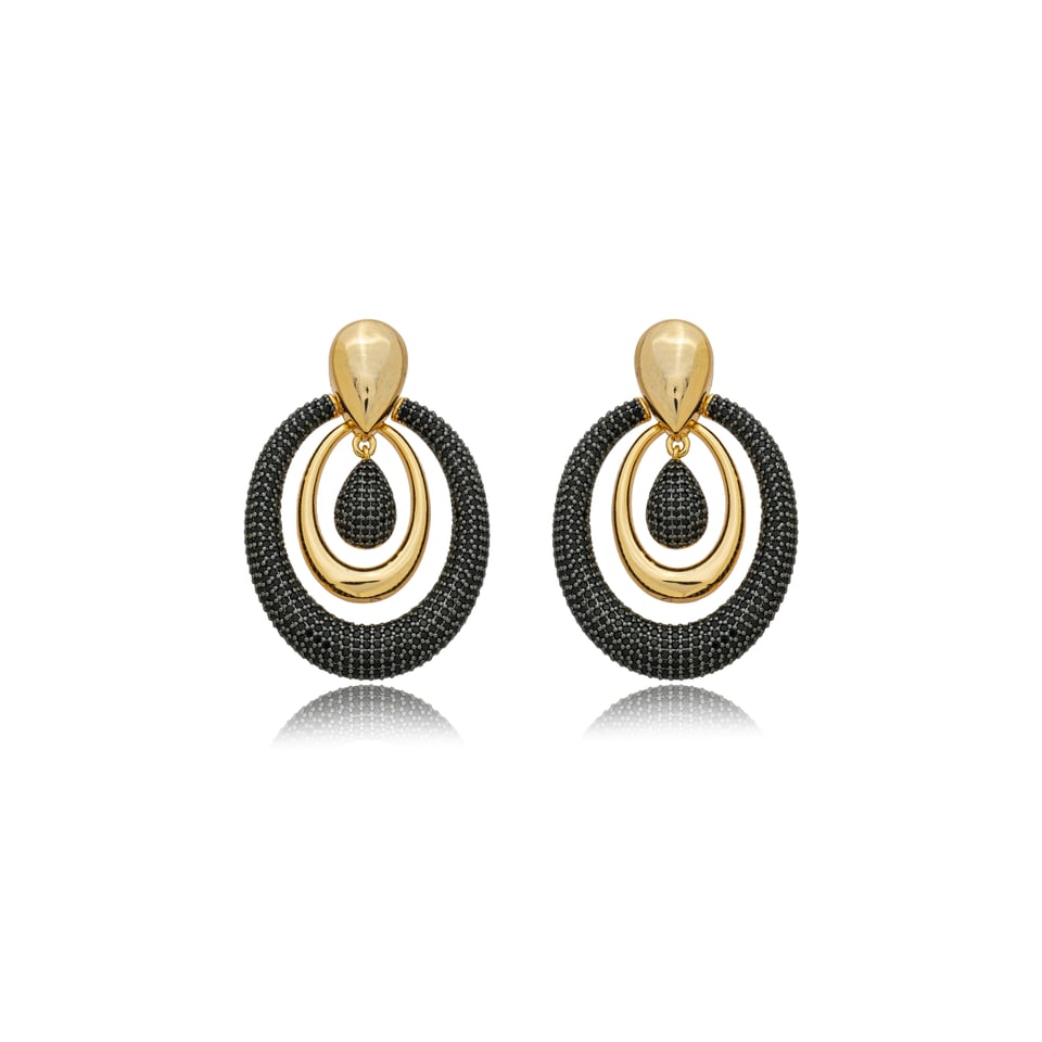 Brinco banho de ouro com design oval e micro zircônias cravejadas na cor preto.