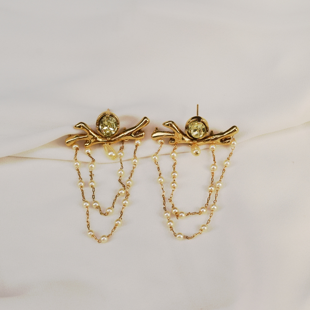 Com inspiração orgânica, o Brinco Palone Design Cristal e Pérolas apresenta estrutura em metal dourado com acabamento ouro vintage, adornada por correntes delicadas de mini pérolas e cristal central em tom champagne. Uma peça elegante e sofisticada que traduz a leveza e o brilho natural do mar.