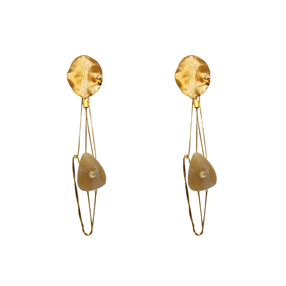Brinco Palone Design Gota Resina inspirado no movimento, com detalhe em gota de resina e base orgânica no metal com efeito martelado. Uma peça única que traduz leveza e conexão com a natureza.