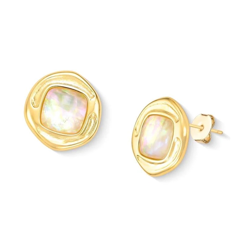 Brinco banho de ouro com pedra natural nautilus facetada no formato quadrado.