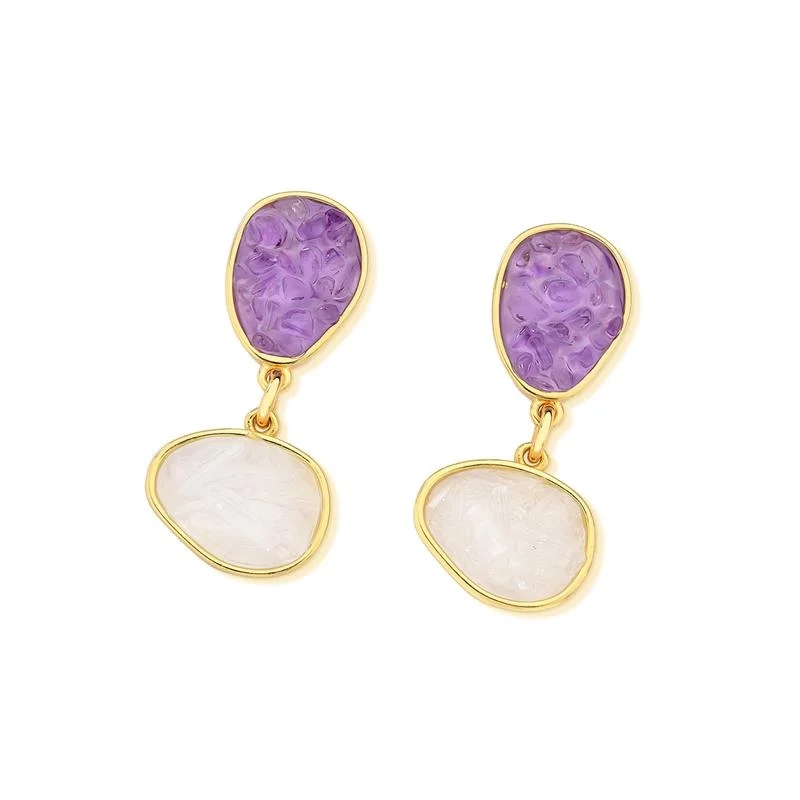 Brinco banho de ouro com aplicação de pedras naturais ametista e selenita fragmentada.