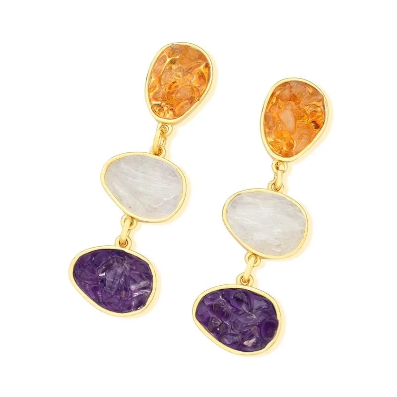 O Brinco Banhado a Ouro com Citrino, Selenita e Ametista Fragmentada é uma semijoia elegante que une beleza natural, energia e sofisticação em um único design. Cada pedra é cuidadosamente aplicada, formando uma composição harmônica entre o tom dourado do metal e as nuances vibrantes dos minerais naturais.