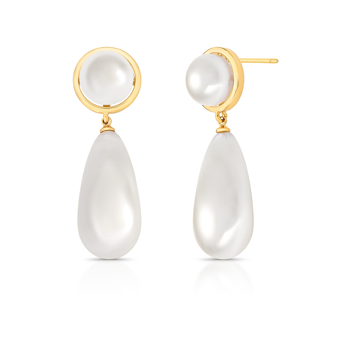 Brinco banhado a ouro com pérola shell redonda e pêndulo em gota alongada, criando um visual clássico e sofisticado. O contraste entre o dourado polido e o brilho suave da pérola adiciona elegância imediata ao look, tornando a peça perfeita para ocasiões especiais ou para elevar produções do dia a dia com charme atemporal.