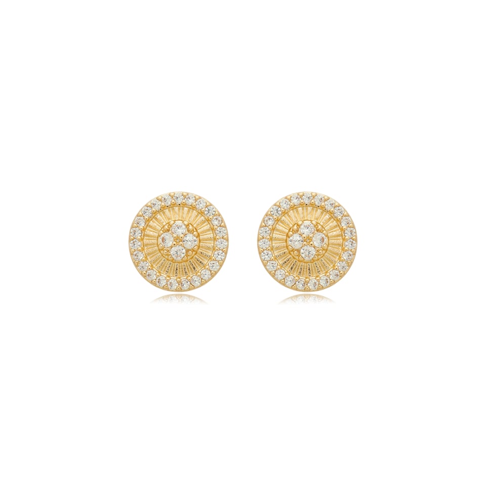 Brinco banho de ouro no formato de pizza com micro zircônias cravejadas na cor branco (cristal).