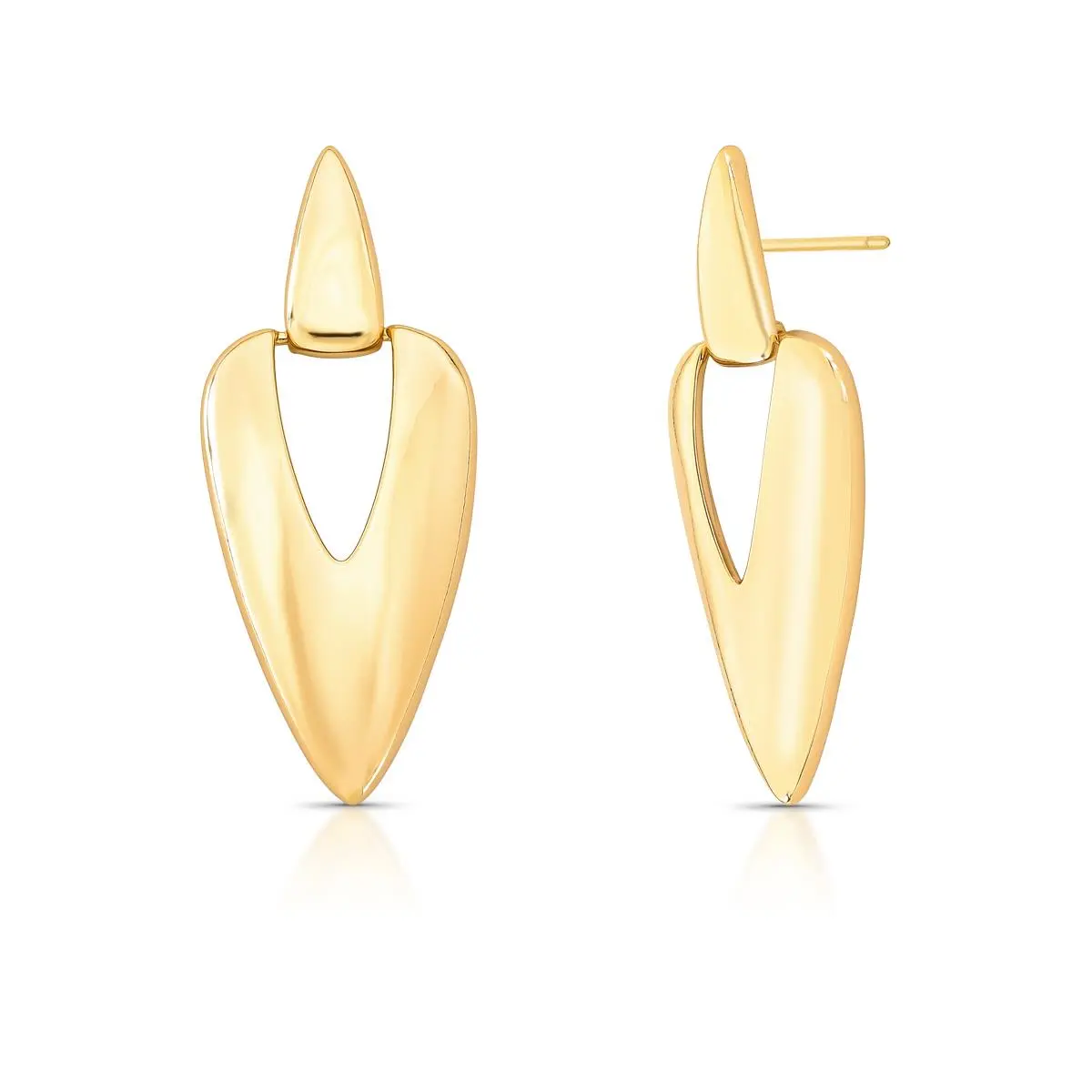 Brinco pêndulo banhado a ouro com design triangular, abaulado e vazado, que combina modernidade e elegância para valorizar qualquer look. Ideal para ocasiões especiais e para composições sofisticadas.