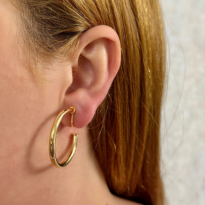 Brinco de pressão banhado a ouro com design de argola lisa e acabamento polido, que reflete elegância e simplicidade. A estrutura leve e o fecho de pressão garantem conforto e praticidade, perfeito para quem não possui orelhas furadas. Um clássico indispensável, ideal para compor desde looks casuais até produções mais sofisticadas. Combine com colares e pulseiras douradas para um visual clean e atemporal.