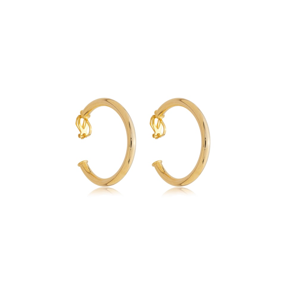 Brinco de pressão banhado a ouro com design de argola lisa e acabamento polido, que reflete elegância e simplicidade. A estrutura leve e o fecho de pressão garantem conforto e praticidade, perfeito para quem não possui orelhas furadas. Um clássico indispensável, ideal para compor desde looks casuais até produções mais sofisticadas. Combine com colares e pulseiras douradas para um visual clean e atemporal.