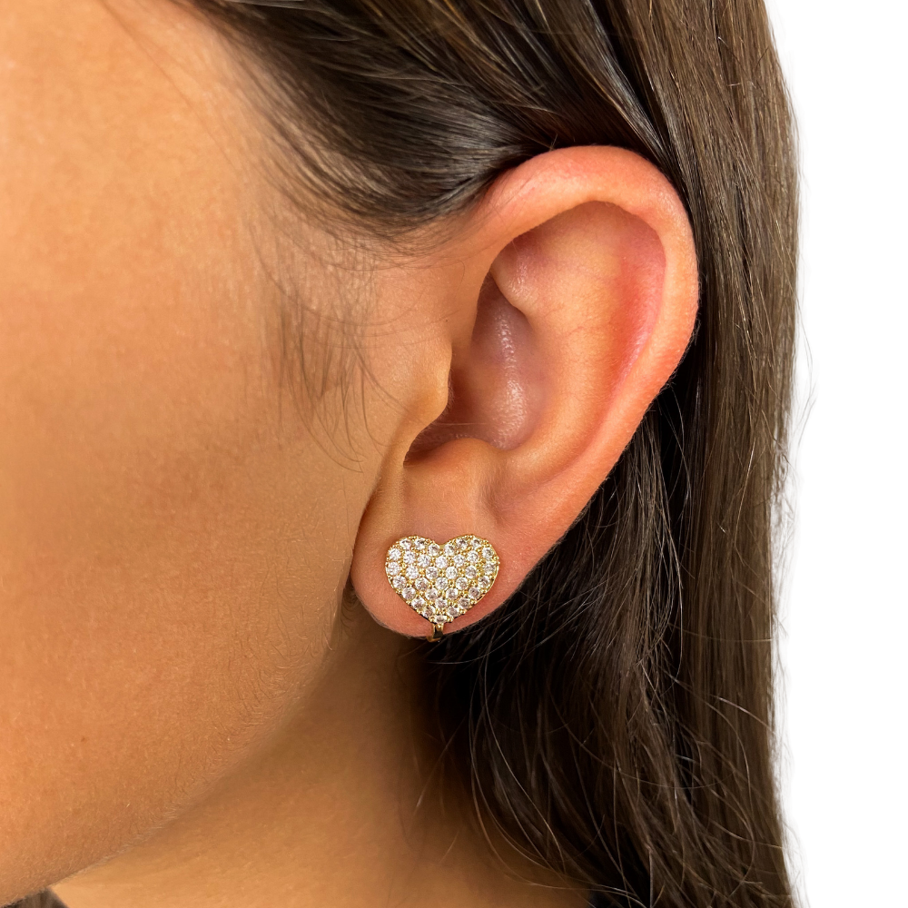 Brinco de pressão com design de coração e cravação de micro zircônias na cor branco (cristal), com banho de ouro que garante brilho e sofisticação. Semijoia confortável e prática, ideal para quem não possui furo na orelha. Perfeito para compor looks delicados e românticos, do dia a dia às ocasiões especiais.