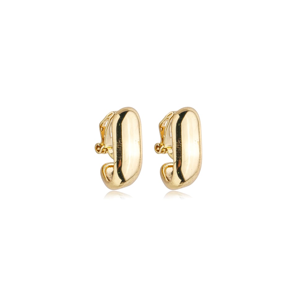 Brinco de pressão curvado em metal liso com banho de ouro, apresentando acabamento polido e design moderno. Semijoia confortável e prática, ideal para quem não possui furo na orelha ou busca versatilidade no dia a dia. Perfeito para compor looks sofisticados, do casual ao elegante, com brilho discreto e atemporal.