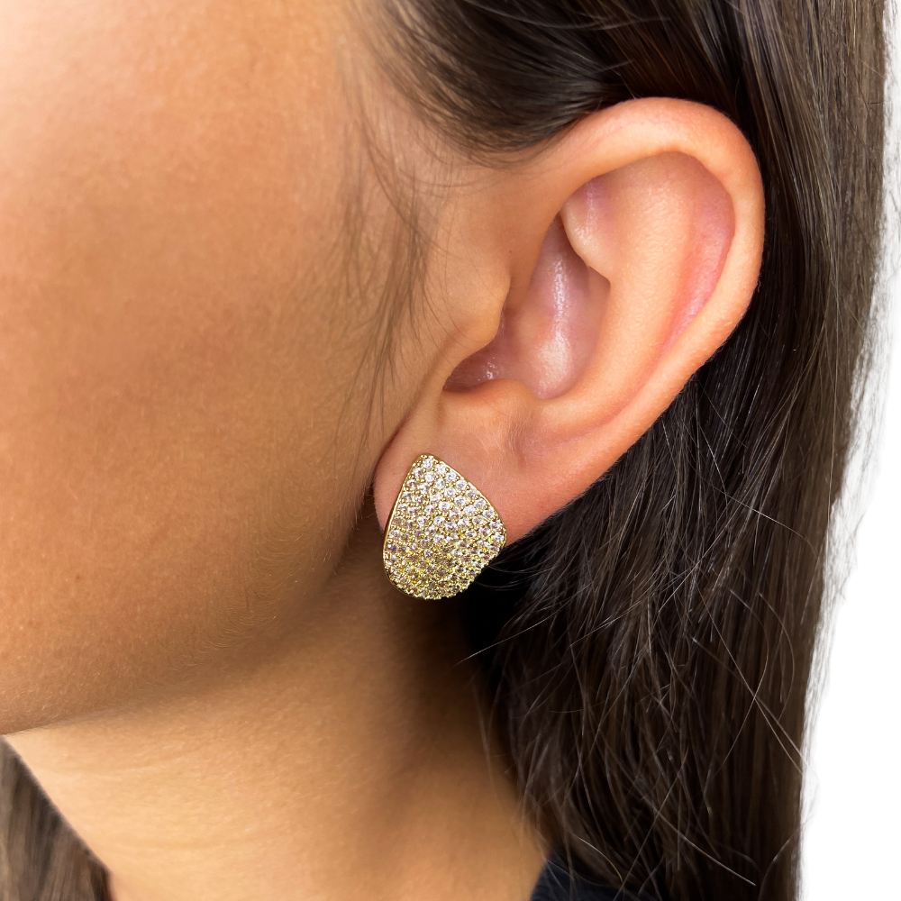 Brinco de pressão com banho de ouro, design curvado e cravação de micro zircônias na cor branco (cristal), que garantem brilho delicado e acabamento elegante. Semijoia confortável e prática, ideal para quem não possui furo na orelha. Peça versátil e atemporal, perfeita para compor looks refinados do dia a dia às ocasiões especiais.