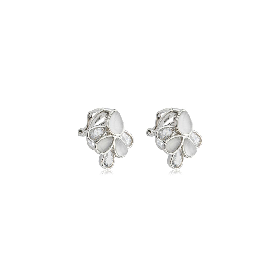 Brinco de pressão com design floral, banho de ródio e aplicação de resina em gota e zircônias na cor branco (cristal), que conferem delicadeza e brilho suave à peça. Semijoia elegante e confortável, ideal para quem não possui furo na orelha. Perfeita para compor looks românticos e sofisticados, do dia a dia a ocasiões especiais.