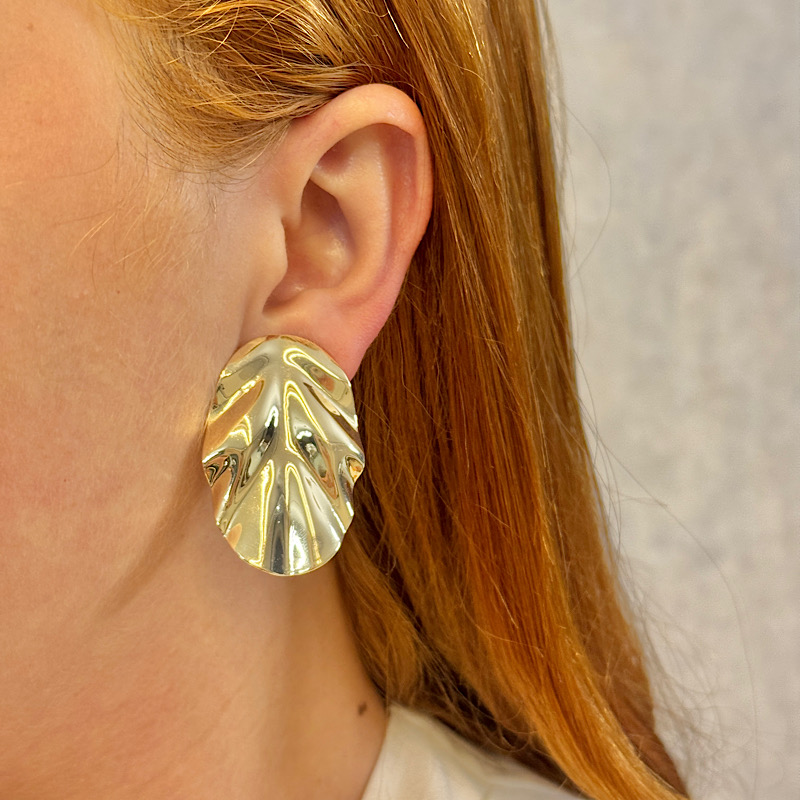 Brinco de pressão banho de ouro com design de folha no metal liso.