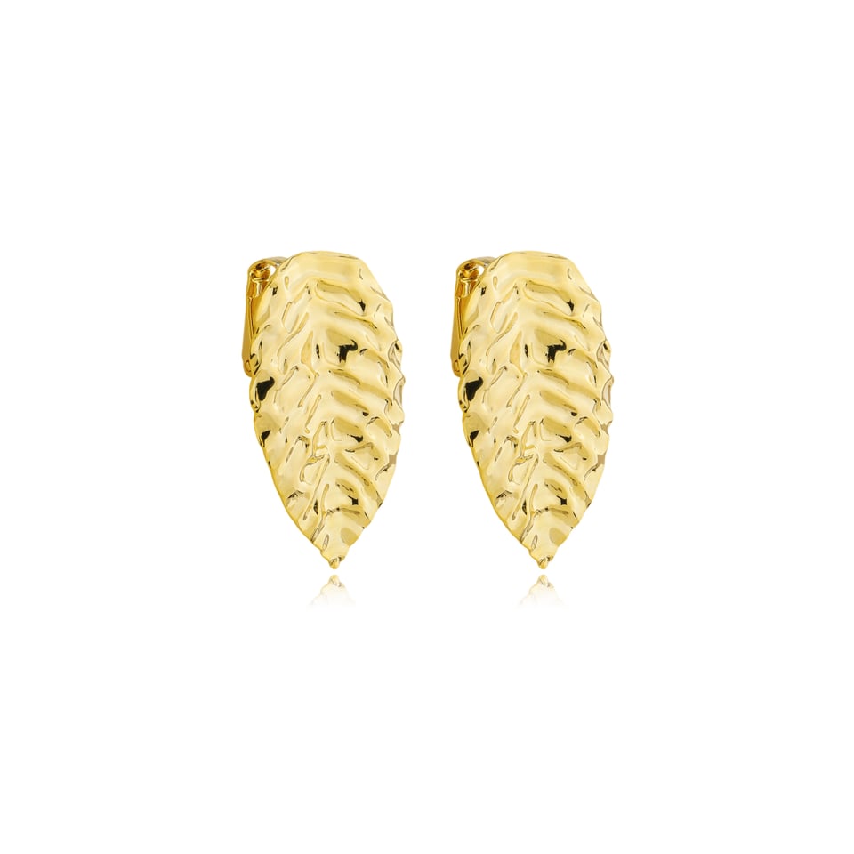 Brinco pressão banho de ouro com design de folha no metal texturizado.