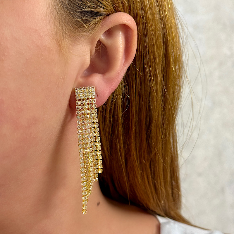 Brinco de pressão banhado a ouro, com franjas formadas por fileiras de zircônias que proporcionam movimento e brilho sofisticado. A estrutura leve e o fecho de pressão garantem conforto durante o uso, sem necessidade de furo.