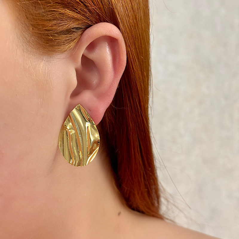 Brinco pressão banho de ouro com design de gota no metal com efeito amassado.