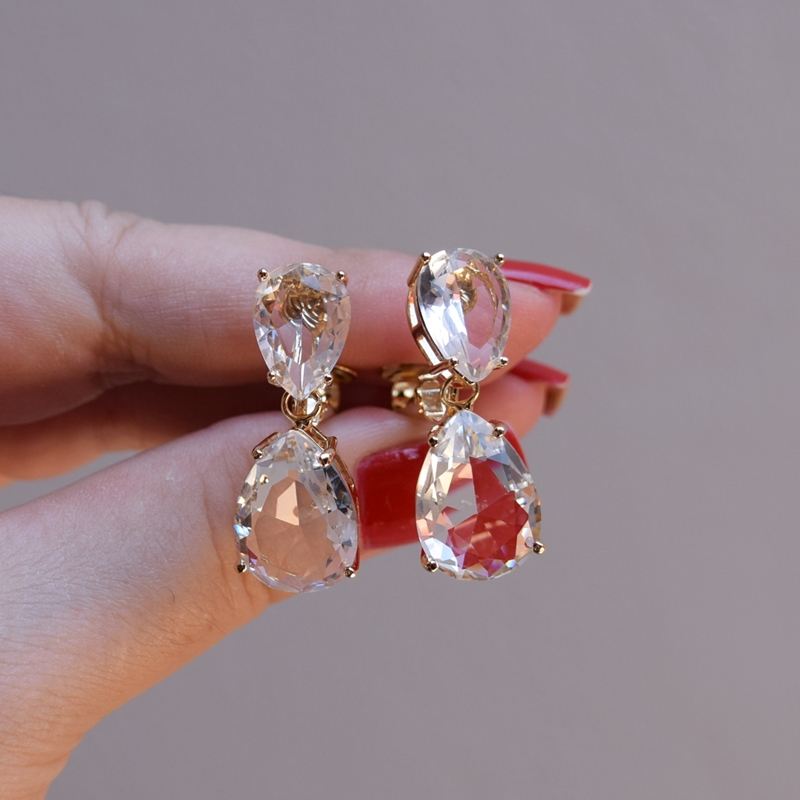 Brinco pressão banho de ouro com aplicação de cristais em gota na cor branco (cristal).