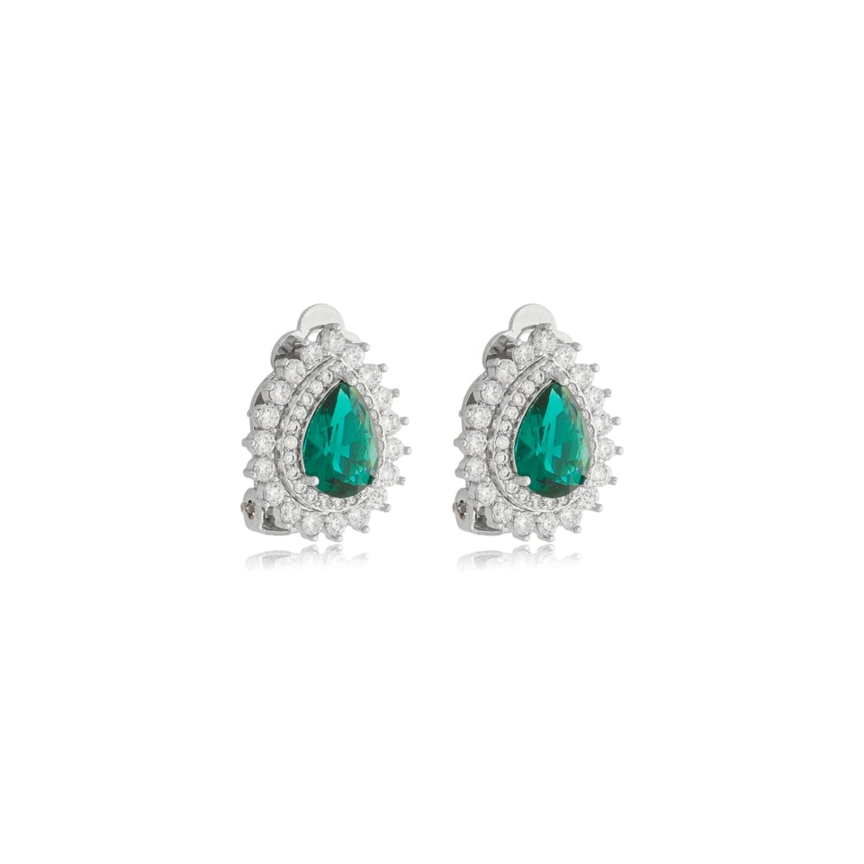 Brinco pressão banho de ródio com cravação de micro zircônias na cor branco (cristal) e zircônia em gota na cor verde esmeralda.