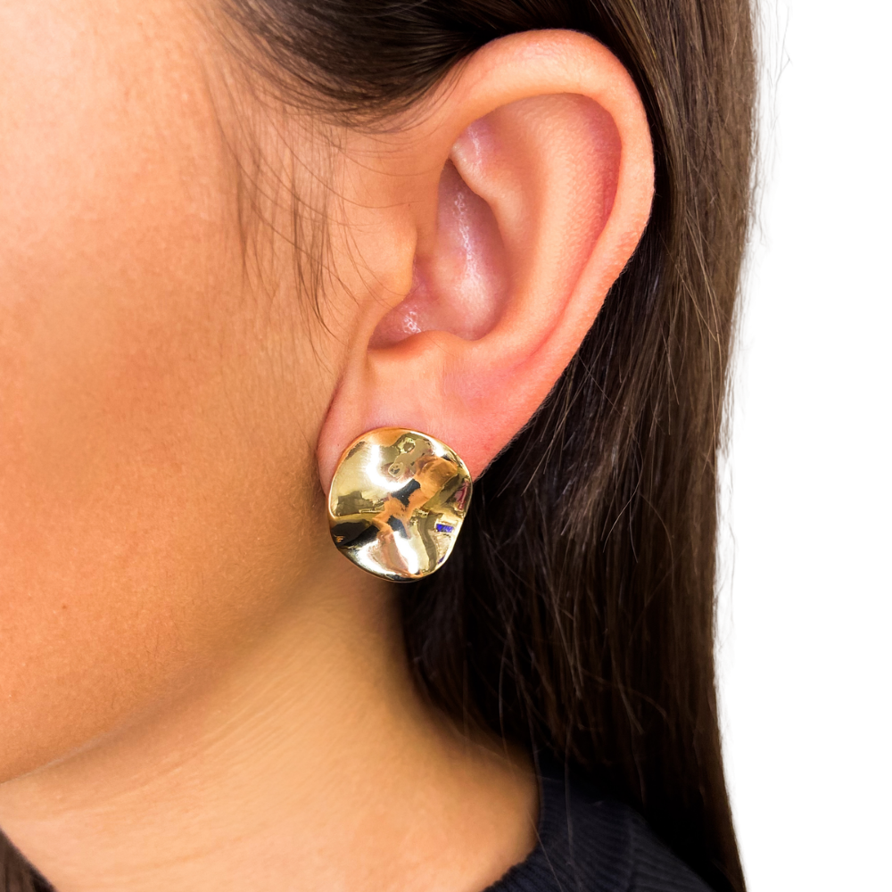 Brinco de pressão com design orgânico redondo em metal amassado e banho de ouro, com acabamento polido que valoriza o brilho e a textura da peça. Semijoia confortável e prática, ideal para quem não possui furo na orelha. Perfeito para compor looks modernos e sofisticados, do casual ao elegante.