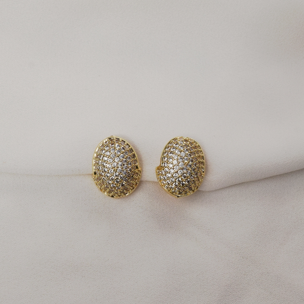 Brinco de pressão com banho de ouro, design oval e cravação de micro zircônias na cor branco (cristal), que garantem brilho delicado e acabamento elegante. Semijoia confortável e prática, ideal para quem não possui furo na orelha. Peça versátil e atemporal, perfeita para compor looks refinados do dia a dia às ocasiões especiais.