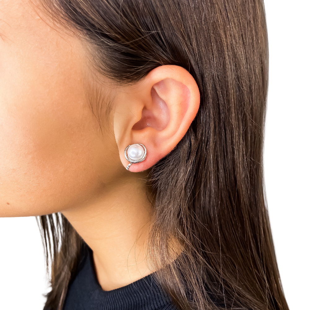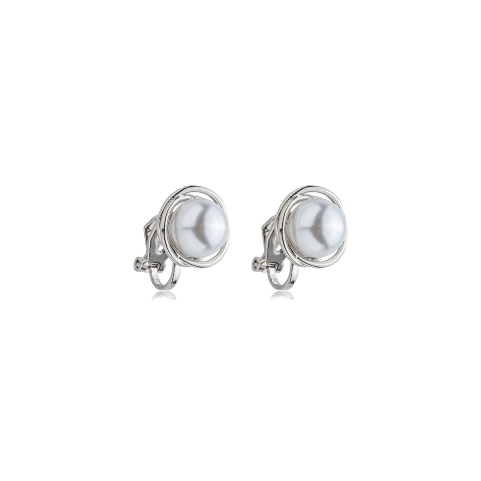 Brinco de pressão com banho de ródio, design sofisticado em metal liso com detalhe em pérola sintética central, que confere elegância e brilho atemporal à peça. Semijoia confortável e prática, ideal para quem não possui furo na orelha. Perfeito para compor looks clássicos e refinados, do dia a dia a ocasiões especiais.