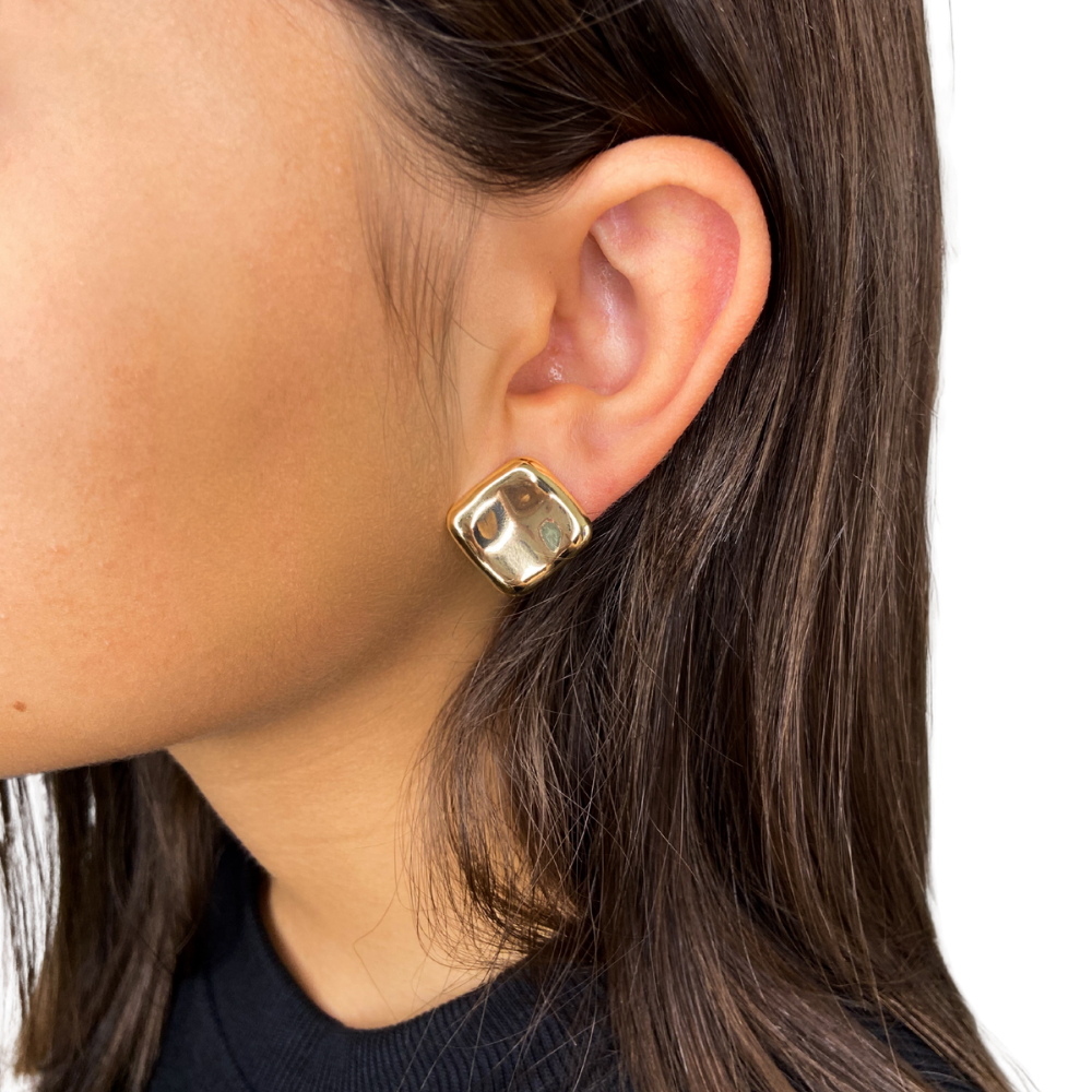 Brinco de pressão com design quadrado em metal amassado e banho de ouro, com acabamento polido que valoriza o brilho e a textura da peça. Semijoia confortável e prática, ideal para quem não possui furo na orelha. Perfeito para compor looks modernos e sofisticados, do casual ao elegante.