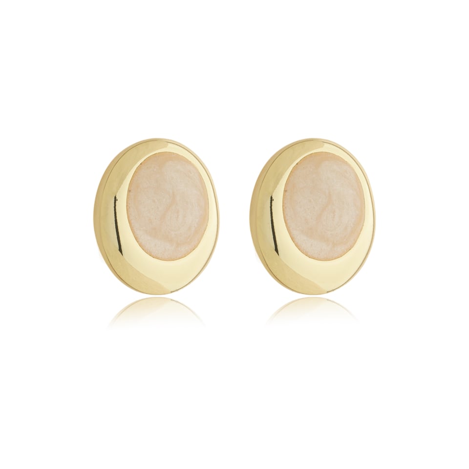 Brinco pressão banho de ouro de design redondo com metal esmaltado na cor bege marmorizado.