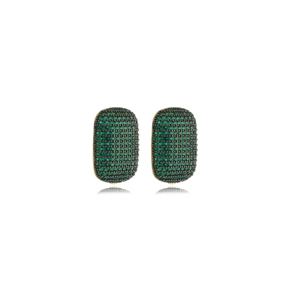 Brinco pressão banho de ouro com design retangular e micro zircônias cravejadas na cor verde esmeralda.