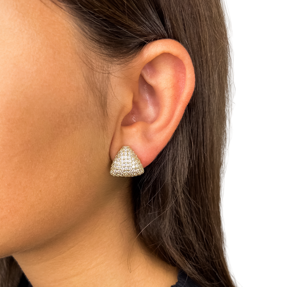 Brinco de pressão com banho de ouro, design triangular e cravação de micro zircônias na cor branco (cristal), que garantem brilho delicado e acabamento elegante. Semijoia confortável e prática, ideal para quem não possui furo na orelha. Peça versátil e atemporal, perfeita para compor looks refinados do dia a dia às ocasiões especiais.