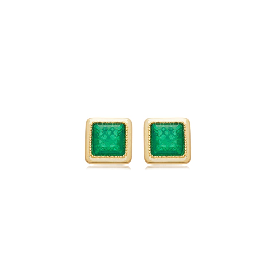 Brinco banho de ouro com design quadrado e cristal na cor verde esmeralda.
