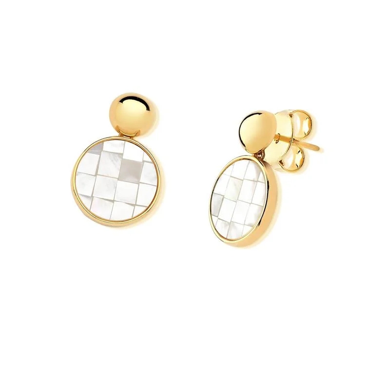 Brinco banho de ouro com base de meia esfera no metal liso polido e pêndulo redondo com mosaico de madrepérola.