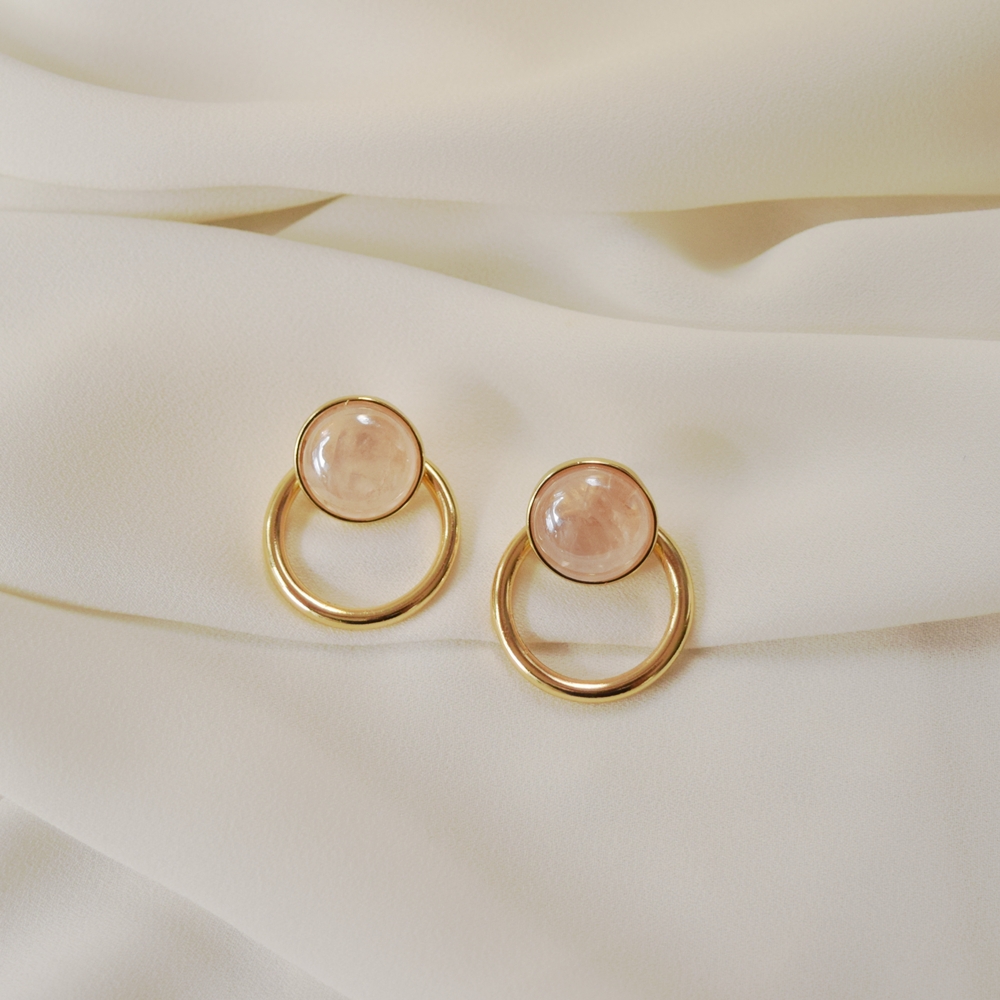 Versátil e elegante, o brinco 2 em 1 é uma semijoia que combina design contemporâneo e a beleza das pedras naturais. A peça possui base com pedra natural de Quartzo rosa perolado em formato redondo, que se destaca pelo brilho suave e pela tonalidade sofisticada.