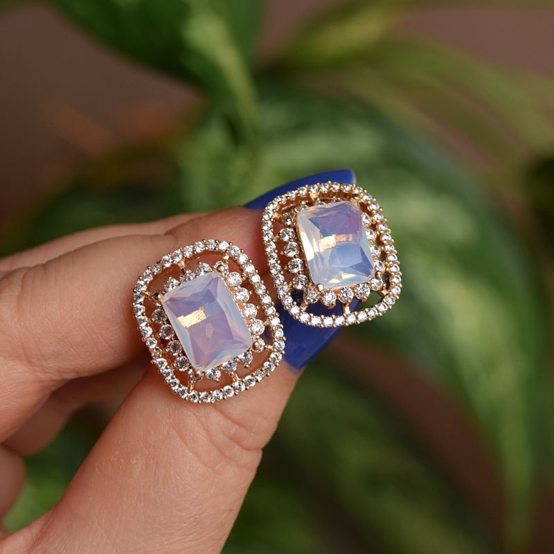 Brinco banho de ouro com cristal retangular na cor branco leitoso e micro zircônias cravejadas na cor branco (cristal).