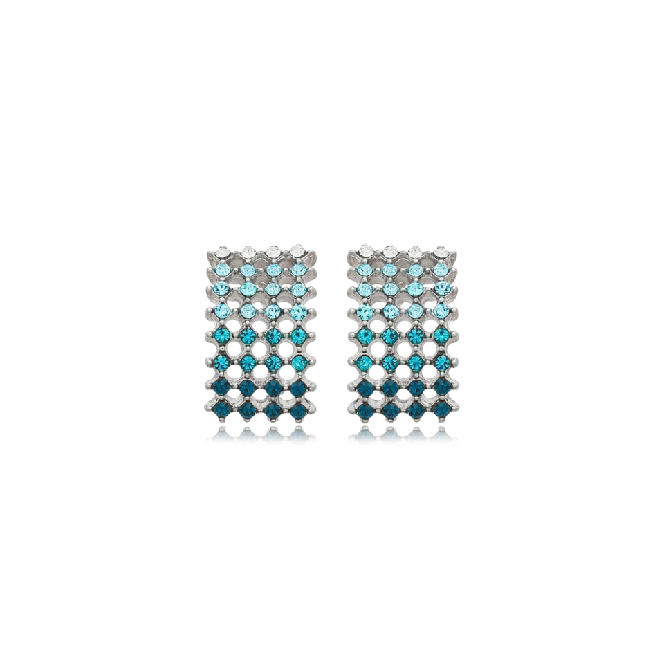 Brinco banho de ródio com aplicações de cristais em tons de azuis.