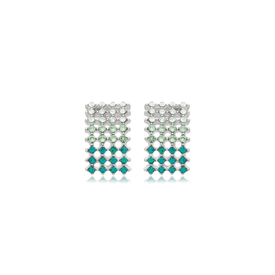 Brinco banho de ródio com aplicações de cristais em tons de verde e no branco (cristal).