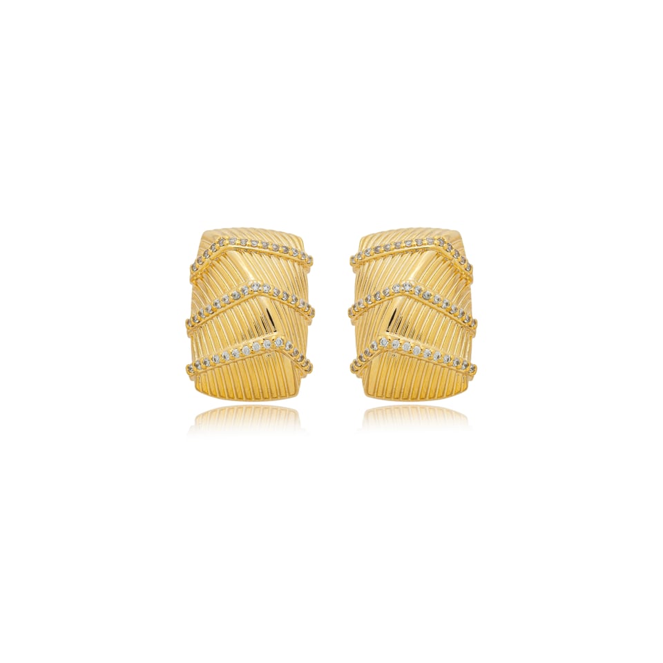 Brinco banhado a ouro com design retangular e micro zircônias cravejadas na cor branco (cristal) no metal texturizado.