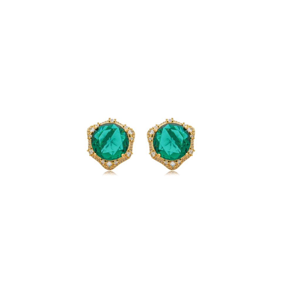 Brinco banho de ouro com micro zircônias cravejadas na cor branco (cristal) e cristal na cor verde esmeralda.